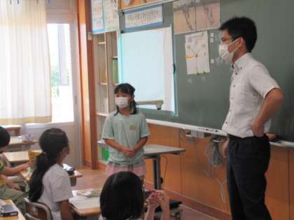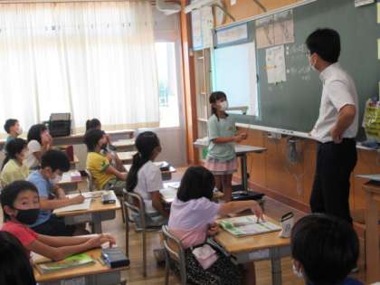 3年生の理科の学習では、午前と午後で影の向きが変わるのはなぜか、考え、話し合いました。積極的に前に出て話すことができる子供たちです。