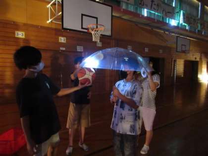 6年生の理科では、月の見え方の決まりについて、体育館でグループごとにダイナミックな実験をして考察しました。