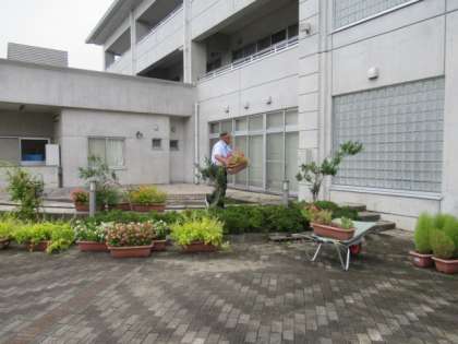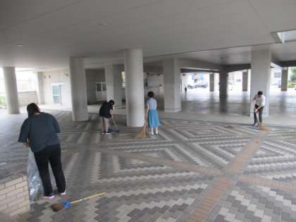 風の影響で、にこにこさわやか広場は樹木の葉だらけになっています。子供たちが登校してくる前に、職員で清掃を行いました。