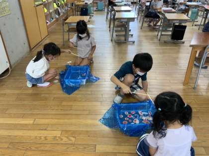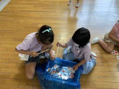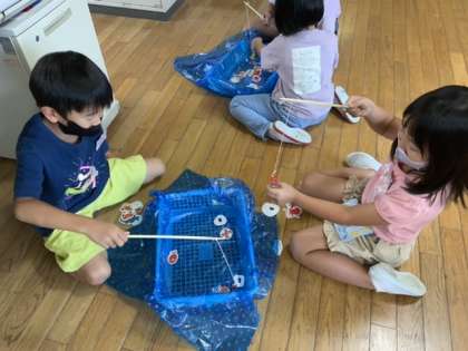 算数科の学習です。お魚を釣った数だけ色をぬります。ゲーム感覚で楽しいです。先生の「休憩時間にもやっていいですよ」の言葉に子供たちは大喜びです。