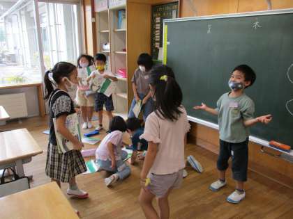 国語科では、「やくそく」の音読をしています。やりたい役になって、音読の仕方を考えたり、友達とどんなふうに言うといいかを相談したりしました。