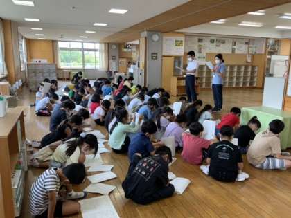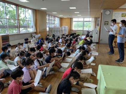 今日は、まず教師がお手本の読みをしながら、お話の流れを確認しました。子供たちはさっそく意欲満々になっています。