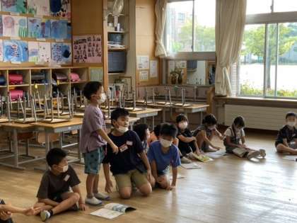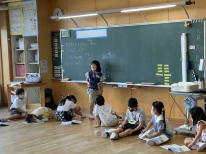 楽しく歌った後は、旋律や伴奏などから聴き取ったことを話し合いました。また、歌詞から感じる情景なども子供たちは自由に想像しながら発言することができました。これらを共通事項とつないでいくことで、音楽科の知識としての学びが出来上がっていきます。