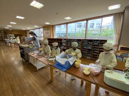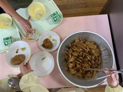 お待ちかねの給食の時間です。毎日身支度を整えて、おしゃべりをせず準備に取りかかっています。1年生の子供たちはお仕事がとても上手になっています。さあ、今日のとっておきのメニューは、ハンバーグです。