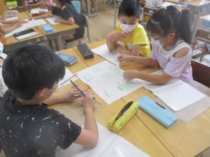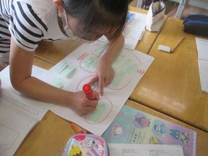 国語科では、山小屋で過ごすなら何を持って行きたいか話し合う学習に取り組んでいます。付箋を使って、意見を出し合ったり、出た意見を整理したりしました。