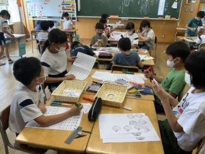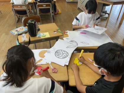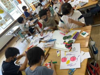 外国語活動で使う野菜や果物のカードをつくりました。色を考えて丁寧に作業を進めている子供たちです。