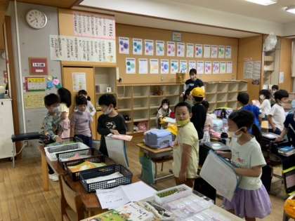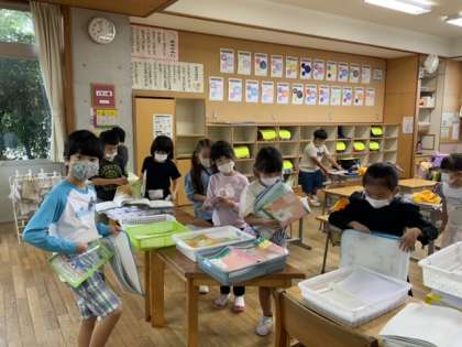 三連休に臨時休業が加わり、4日ぶりの登校となりました。たくさんの提出物があります。並んで順に提出していきました。