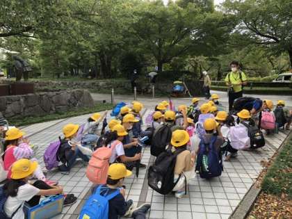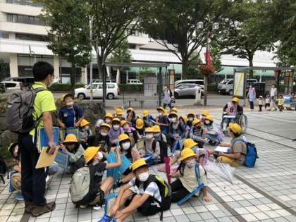市役所前まで移動しました。先生の「神通川は昔はこの辺りを流れていてとても広かったんだよ」の言葉に驚きの子供たちです。子供たちが座っている場所も元は神通川です。