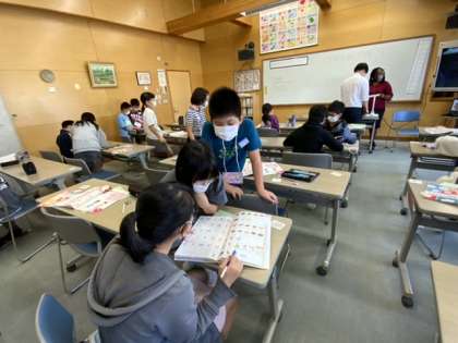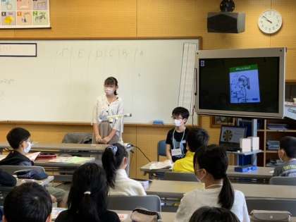 外国語科の授業では、できること、できないことを英語でスピーチしました。ルーレットで前に出る人が決まるため、緊張感もあります。