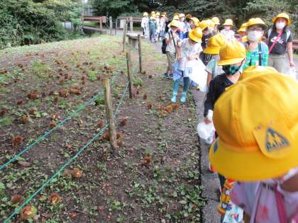 ファミリーパークには、たくさんの木や虫がいます。生活科「あきを楽しもう」の学習として、秋見付けをしました。コオロギやバッタを捕まえたり、ドングリや栗を拾ったり、綺麗な色の葉っぱを拾ったり・・・。秋を感じられるものをたくさん見付けていました。