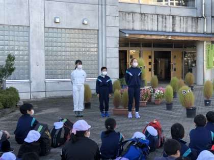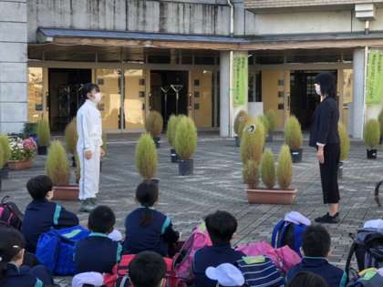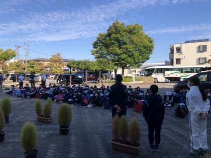 おはようございます。爽やかなお天気です。今日から一泊二日の予定で5年生は宿泊学習に出かけます。まずにこさわ広場で出発式を行いました。