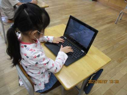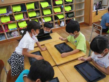 学習の様々な場面でクロームブックを活用しています。しりとりゲームをしたり、対尾イング練習を始めたりしました。困っている友達がいると、自然と周りの子供が教えてあげるなど、素敵な姿が見られました。
