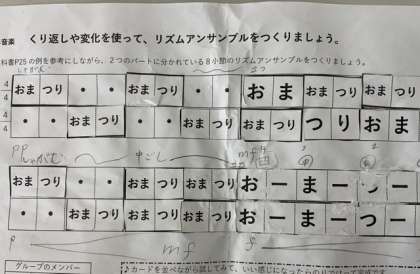 音楽科では「おまつり」の言葉のみを使ってのリズムアンサンブルに取り組んできました。前回に幾つかのグループに発表してもらいましたが、今日はその続きをしました。