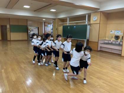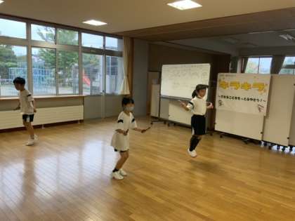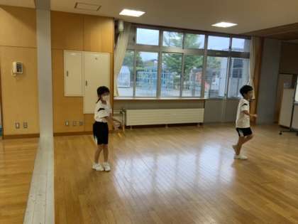 雨模様で残念ながら外での活動はできません。縄跳びに励んだり列車ごっこをしたりして楽しく過ごしています。