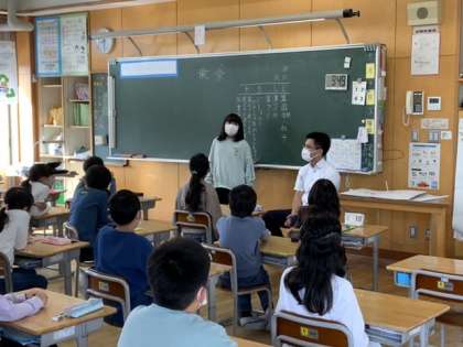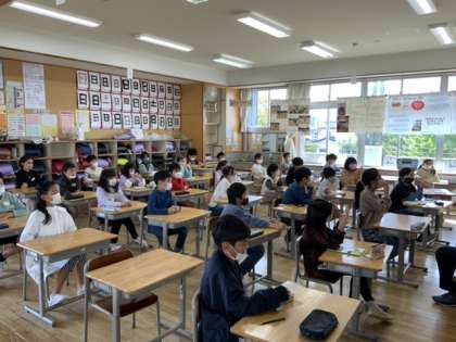 朝の会の様子です。担当の子供が前でお話をしています。子供たちはそれをきちんと聞き取り、後半は質疑応答をしたリ、意見交流をしたりします。このときは先生も一緒に聞きます。聞く力、関わり合う力の向上をねらっています。今朝は釣りに関わる話題でした。