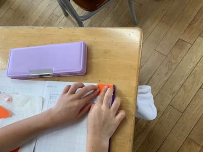 直角をつくってみました。教室や自分の持ち物にはたくさんの直角があることを子供たちは見つけていました。