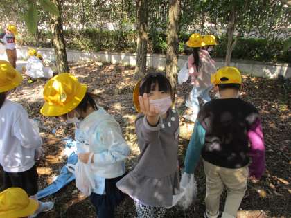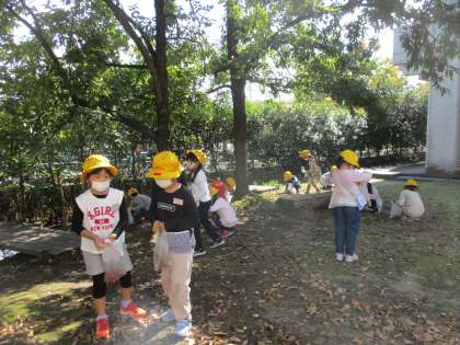 学校の周りをみんなで歩いて、2回目の秋みつけをしました。1回目よりも葉っぱが赤や黄色、茶色に変わっている様子に驚いたり、緑だったどんぐりが茶色くなっていることに喜んだりしていました。たくさん秋の”宝物”をゲットした子供たちは、大事そうに袋にしまっていました。