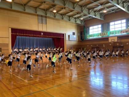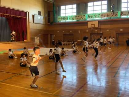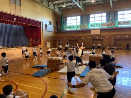 体育科で学習した跳び箱、マット、縄跳び等の運動で構成しました。校内発表会からさらにグレードアップし、大変力強い演技を子供たちは見せてくれました。