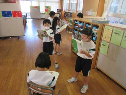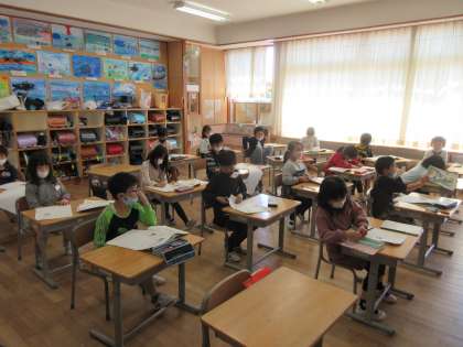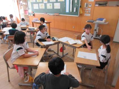 国語の学習では「お手紙」に取り組んでいます。かえるくんとがまくんの気持ちを考えながらワークシートに書き込みを行ったり、音読したりしています。