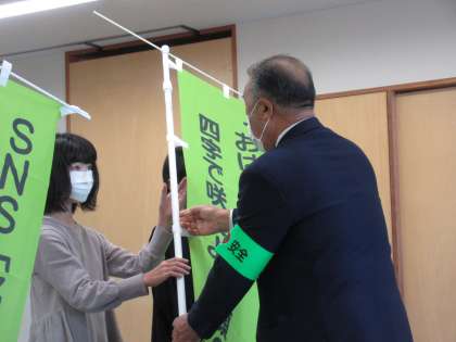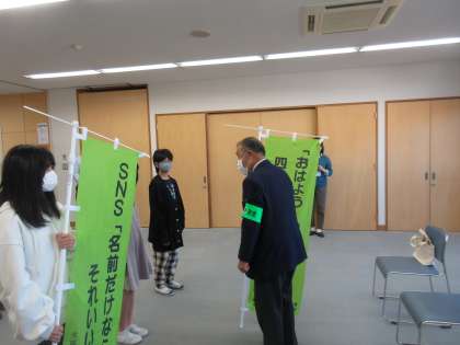 式では、選ばれた3人の子供たちに、標語が書かれたのぼり旗が手渡されました。
