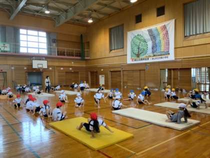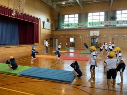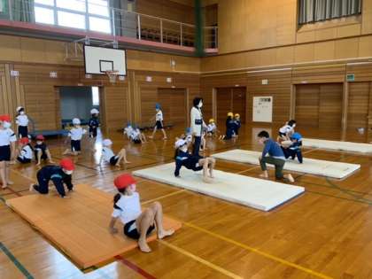 2年生では、3クラス合同でマット運動に取り組みました。いろいろな遊び的な動きから、マット運動に必要な動きへと発展させていきます。