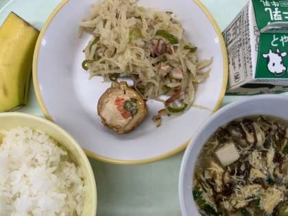 ペペロンチーノとは、イタリア語で「唐辛子のスパゲティ」という意味であり、使用する材料は、スパゲティの他、にんにく、唐辛子、オリーブオイルの3種類のみです。にんにくの旨味と風味を生かした料理で、つくる人の腕が試されると言われる料理です。今日は、スパゲティの代わりに、切り干し大根を使用しています。ブロッコリーやピーマンなどの野菜が入り、色合いも鮮やかに仕上げました。