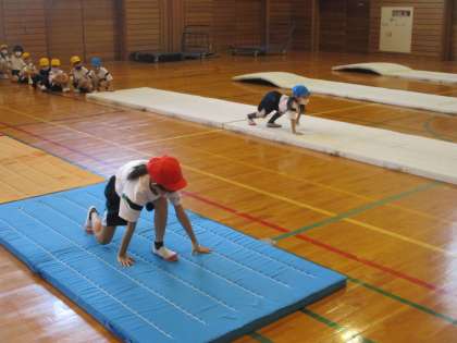 体育科の学習では、マットの練習が始まりました。使い方や約束を先生から聞き、早速練習スタート!イヌ歩きやクマ歩き、クモ歩きなどを練習しました。