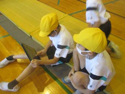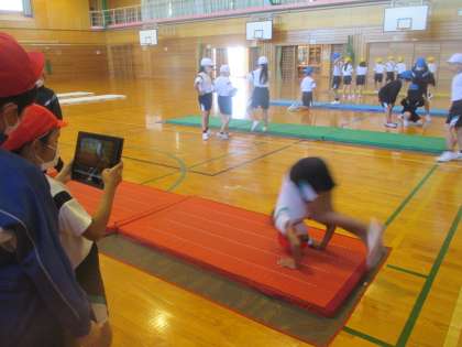 体育科のマット運動では、前転と後転に取り組みました。クロームブックで動画を撮り、改善点を話し合いました。