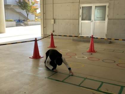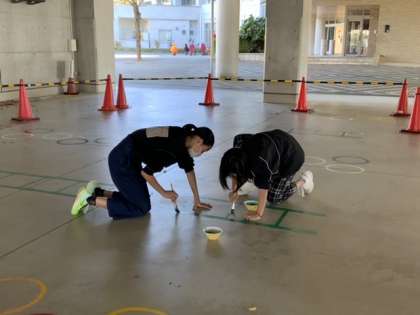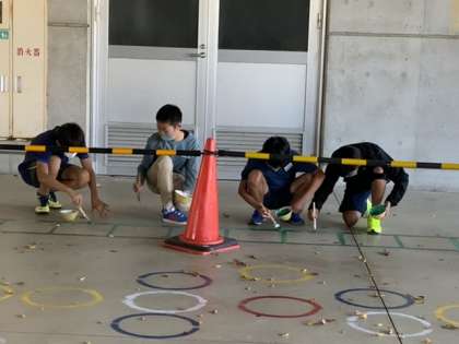 本校のピロティには、ラダーやケンパなど、基本的な運動能力向上をねらった仕組みがあります。しかし、日頃から使用していると、だんだんとそのペンキのラインが消えていってしまいます。ここ数日、担当の委員会の子供たちがそのラインを休憩時間を使って補修してくれています。