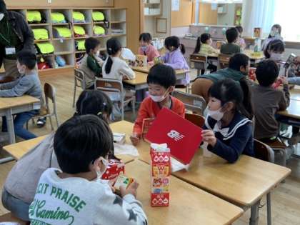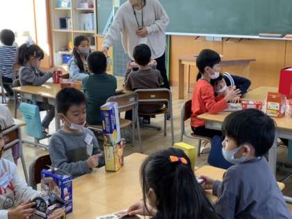 子供たちは、思い思いに箱を用意してきました。まずは見せ合いっこをしました。