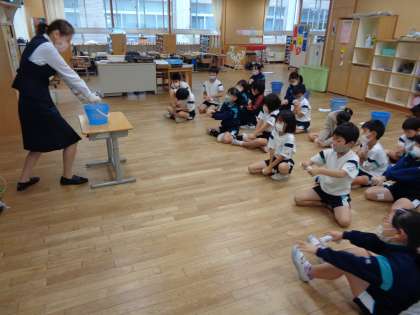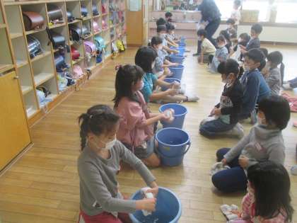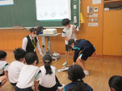 後半は、ダスキンさんから、ほうきやちりとりの正しい使い方やぞうきんの洗い方を教わり、練習しました。