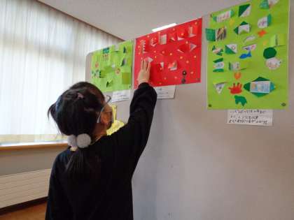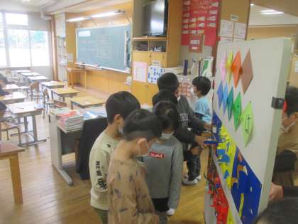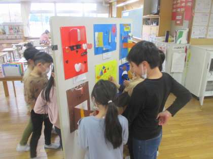 図画工作科で作った、「まどからこんにちは」の作品を鑑賞しました。友達の作品を見て、「まどの形がおもしろいな」「もようがいいな」「まどの中がすてきだな」などと感じたものに、いいねカードを書きました。友達の作品のよいところを、じっくり探す子供たちでした。