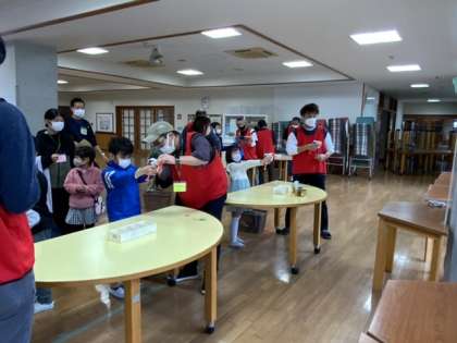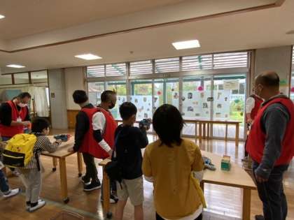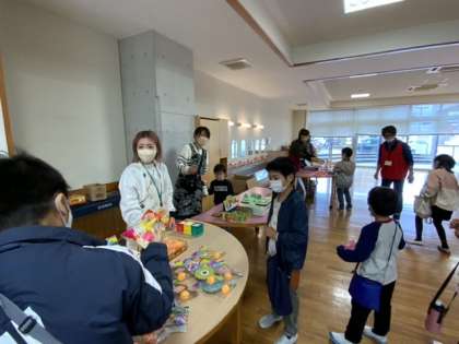 バザーには、物品販売の他、ゲームコーナーが4箇所設定されています。射的コーナーでは、狙いを定めて発射。景品を求めて子供たちは頑張っています。