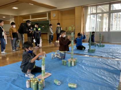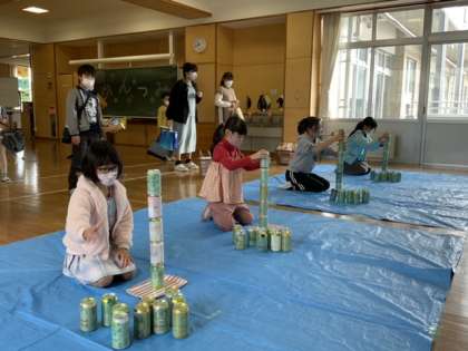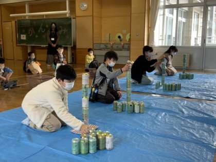 2階多目的教室では、空き缶積みゲームに子供たちは挑戦しています。集中力が試されるこのゲーム。慎重に慎重に。