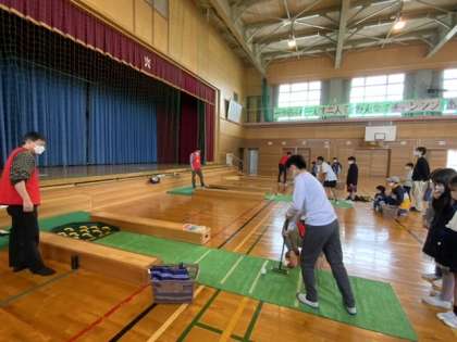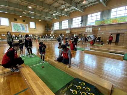 関係の方々が子供たちに丁寧に説明してくださり、子供たちも安心して参加することができています。また、子供たちが高得点をとったとき、周りの大人の方々もいっしょに喜んでくださり、とてもよいムードでゲームが進行しています。
