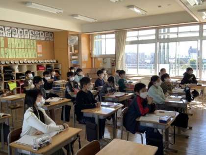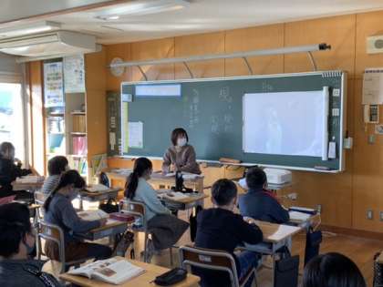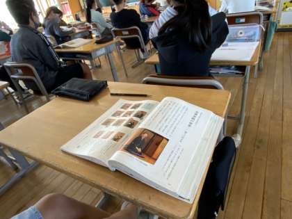 国語科の学習では日本に古くから伝わる芸能についても大切に学習していきます。ここでは、落語を取り上げました。道具は扇子のみ、語りだけで情景や仕草、心情を表現します。DVDでその様子を鑑賞しました。