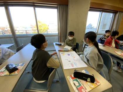 グループで食物連鎖のポスターをつくり、英語で説明します。絵も頼り、ジェスチャーも頼り、でもやはり言葉が一番の拠り所です。楽しく取り組んでいます。