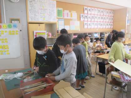 エコキャップを使った創作活動が進んでいます。友達からもらったアドバイスを生かして、それぞれの作品をパワーアップさせようとがんばっています。