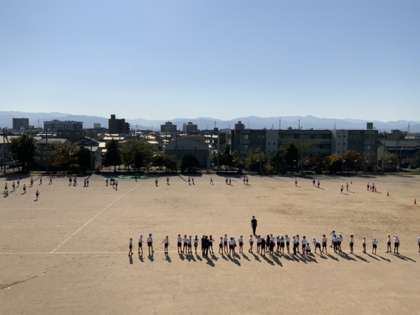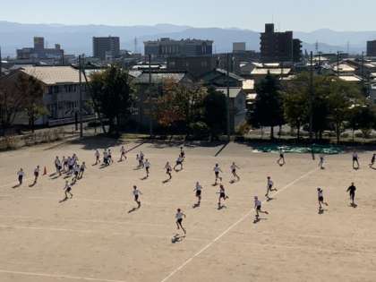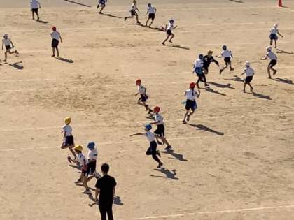 昨日とは一転してお日様のもと、ぽかぽかの陽気に恵まれて、思い切り走る子供たちです。「タグおに」を学年みんなで楽しんでいます。