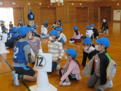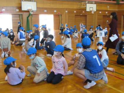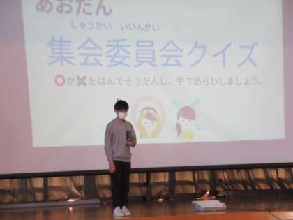 お昼休憩には青団の子供たちが集まって、集会を行いました。クイズは3問、縦割り班で力を合わせて相談し、回答することができました。