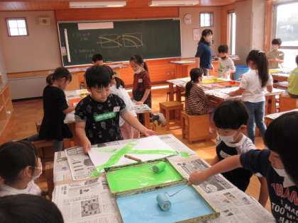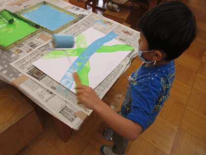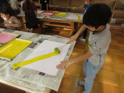 色を付けたローラーを転がして作品製作をしました。