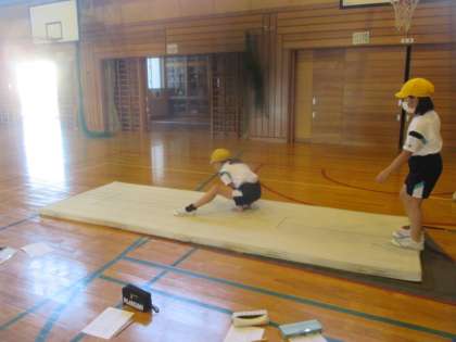 体育科のマット運動では、開脚前転や跳び前転等の、発展技に挑戦しています。