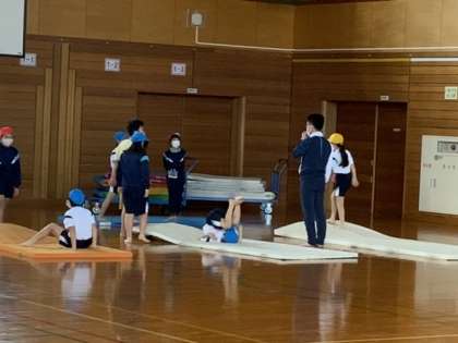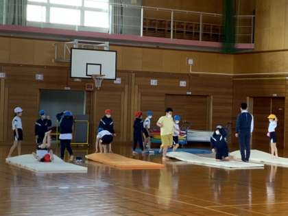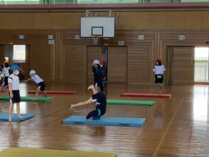 光陽っ子は、マット運動も積極的。怖がらず、いろいろな技に挑戦して技能を高めています。