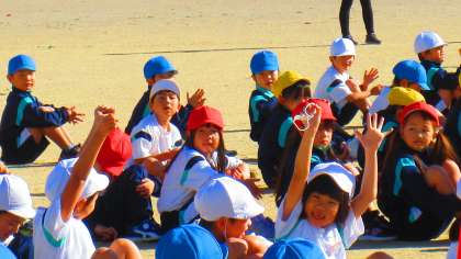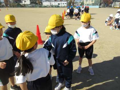 作戦タイムには、どうしたら速くバトンを受け渡しできるか考えて練習したり、順番を工夫したりするチームも。友達との関わり合いの中で成長している子供たちです。