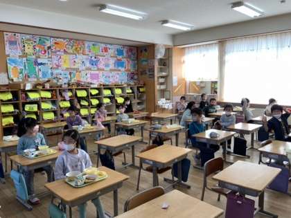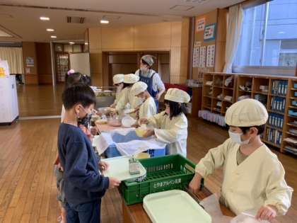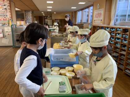 手際よく配膳を進める担当の子供たちと、よい姿勢で待つ子供たちです。