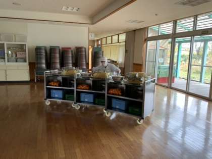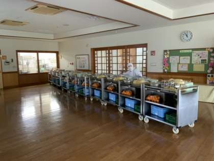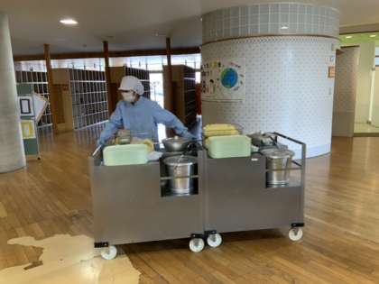間もなく給食の時間です。調理が終わり、調理員の方々が各教室にワゴン車を運び出してくださっています。