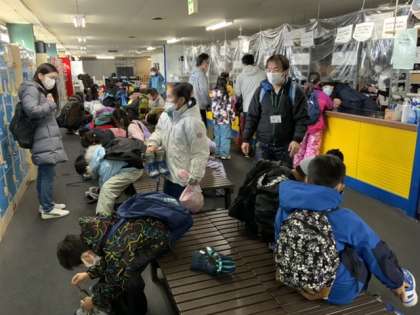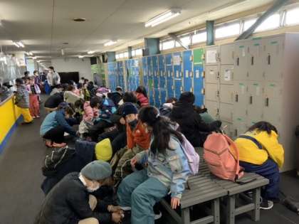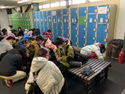 貸しスケート靴を借りて履きます。初めてという子供たちがたくさん。保護者の方々にもお手伝いしていただきました。
