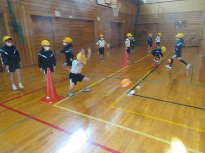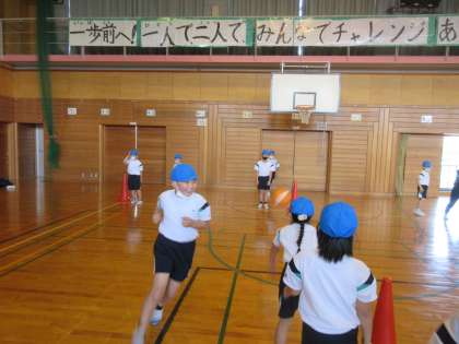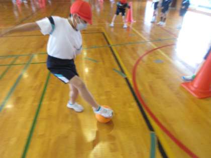 今日から2年生の体育ではキックベースを行っています。今日はウォーミングアップとして、ボールを転がしたり、蹴ったりしてパス練習をしました。ボールを一生懸命に追いかける子供たちでした。