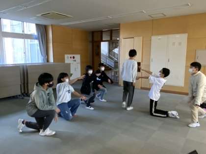 グループごとに表したいイメージを共有して、それに合わせた表現を考えていきます。互いに思ったことを伝え合いながら、力を合わせて作品づくりに取り組むことができました。