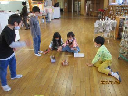 秋のおもちゃで遊びました。どのおもちゃも秋いっぱいでしたね!友達のおもちゃをじっくりと見たり、どんな工夫がされているかを聞いたりしました。